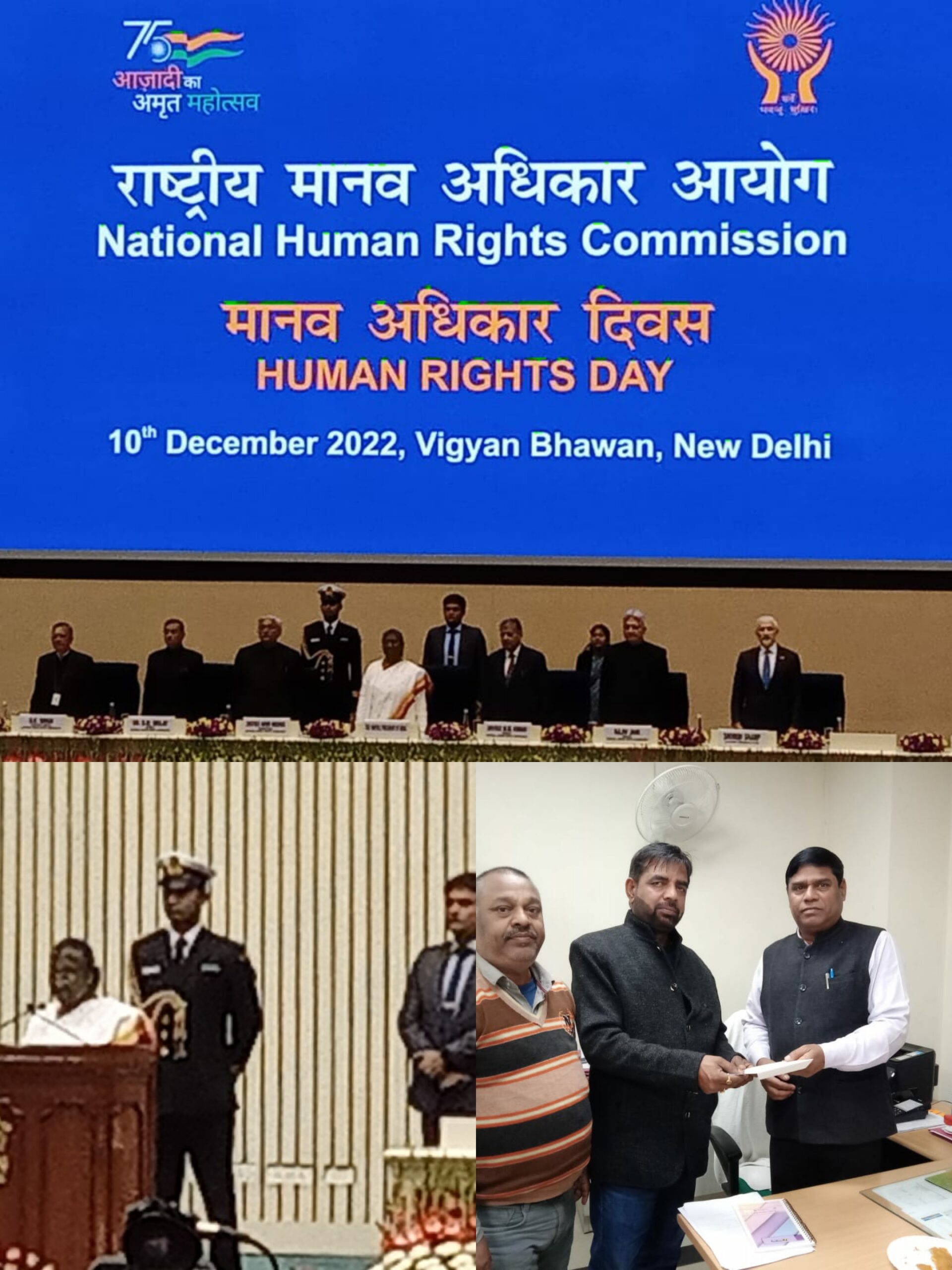 नई दिल्ली में अंतराष्ट्रीय मानवाधिकार दिवस पर शानदार कार्यक्रम का आयोजन किया गया. राष्ट्रीय मानवाधिकार आयोग की तरफ से विज्ञान भवन में आयोजित इस कार्यक्रम में माननीय राष्ट्रपति द्रोपदी मुर्मू मुख्य अतिथि थी. वही झारखण्ड से आमंत्रित किए गए झारखण्ड मानवाधिकार संघ के अध्यक्ष दिनेश कुमार शर्मा, किनू और मानवाधिकार संघ के सलाहकार, सह वरिष्ठ सदस्य मनोज सिंह भी इस भव्य कार्यक्रम के गवाह बनें. राष्ट्रीय मानवाधिकार आयोग के एएसपी श्री ईशम सिंह ने भी शिरकत की. उन्होंने खुद मनोज सिंह और दिनेश शर्मा, किनू को कार्यक्रम का निमंत्रण दिया.