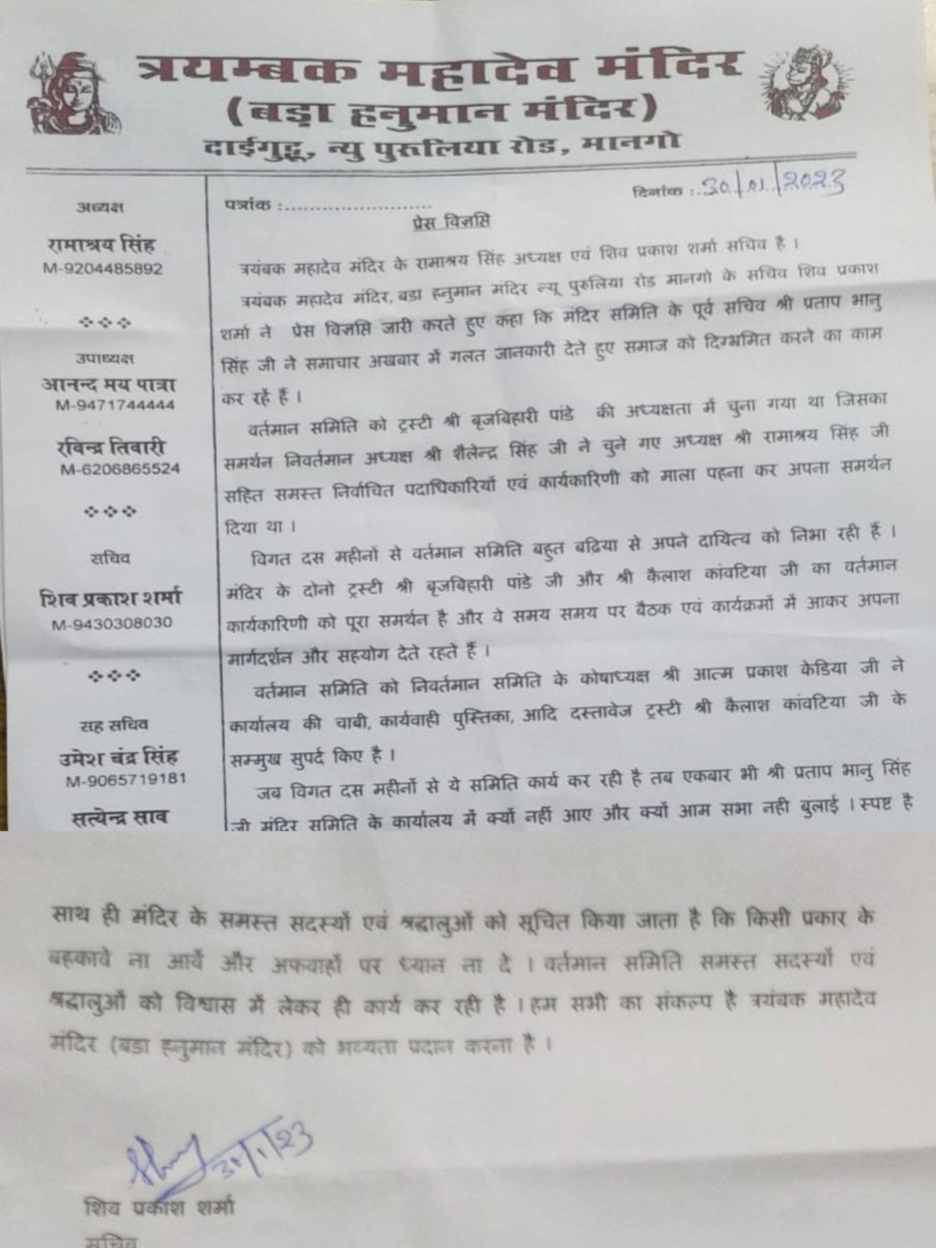 त्रयंबक महादेव मंदिर, बड़ा हनुमान मंदिर न्यू पुरुलिया रोड़ मानगो के सचिव शिव प्रकाश शर्मा ने प्रेस विज्ञप्ति जारी करते हुए कहा कि मंदिर समिति के पूर्व सचिव श्री प्रताप भानु सिंह जी ने समाचार अखबार में गलत जानकारी देते हुए समाज को दिग्भ्रमित करने का काम कर रहें हैं l