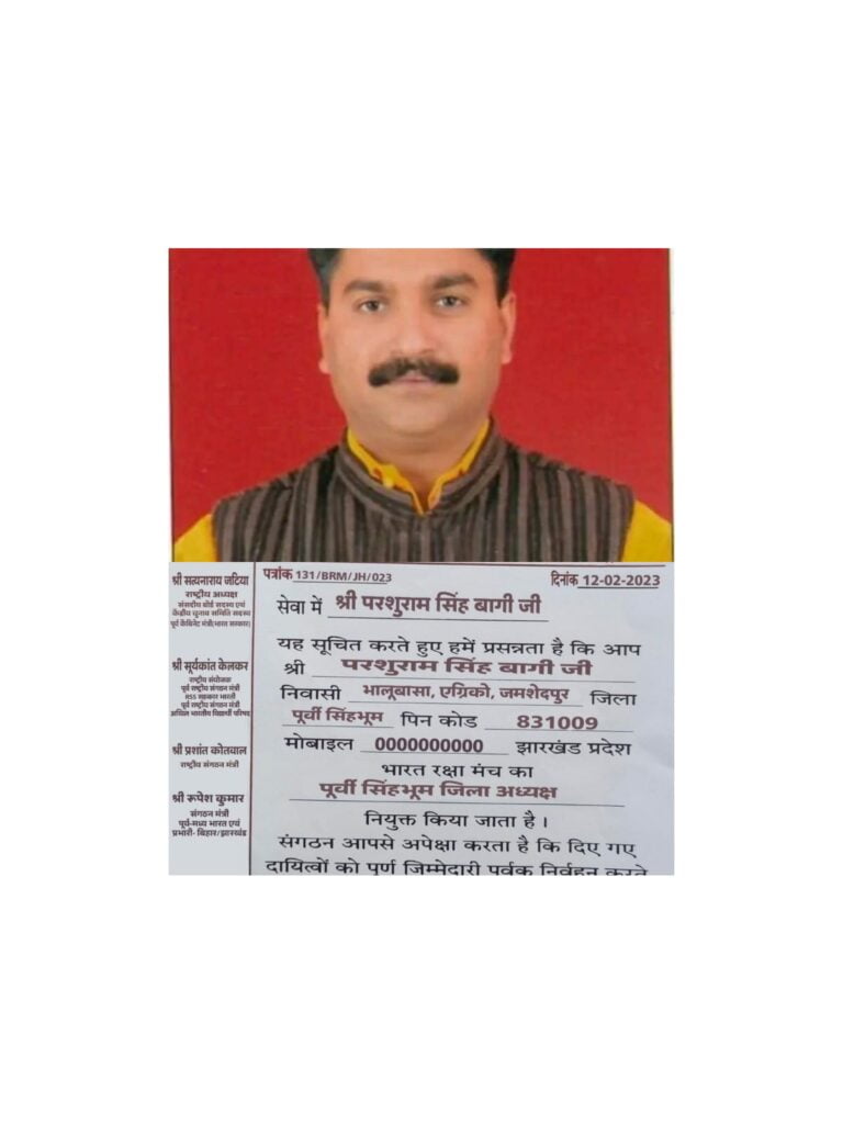 समाजसेवी श्री परशुराम सिंह बागी को भारत रक्षा मंच का पूर्वी सिंहभूम जिला अध्यक्ष नियुक्त किया गया…