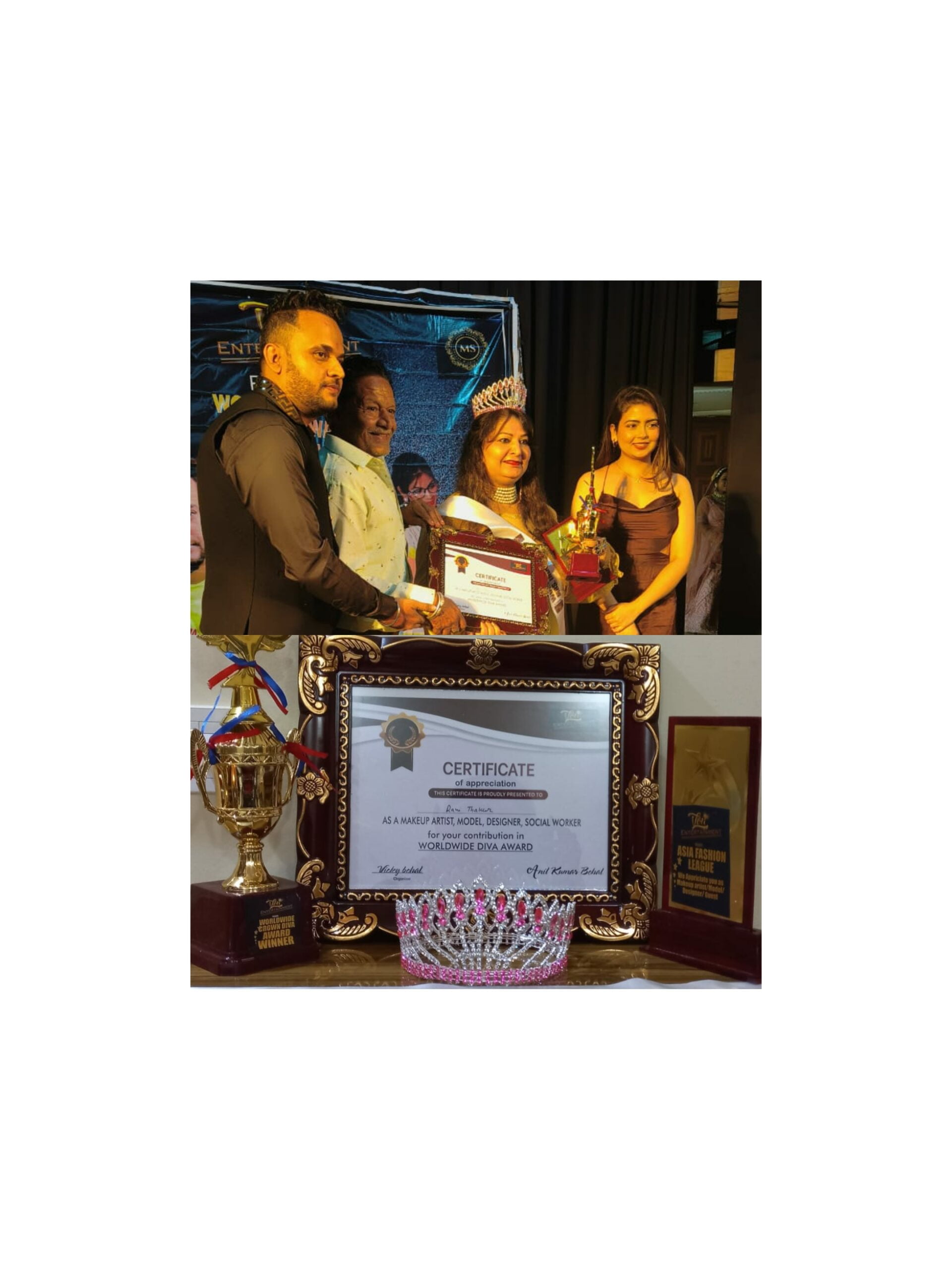 लखनऊ मे आयोजित अवार्ड शो मे वर्ल्डवाइड ब्यूटी एंड फैशन अवार्ड का सम्मान प्राप्त हुआ। यह सम्मान उन्हें ट्रॉफी , क्राउन , सैश और सर्टिफिकेट वर्ल्डवाइड क्राउन डीवा अवार्ड का देकर दिया गया।