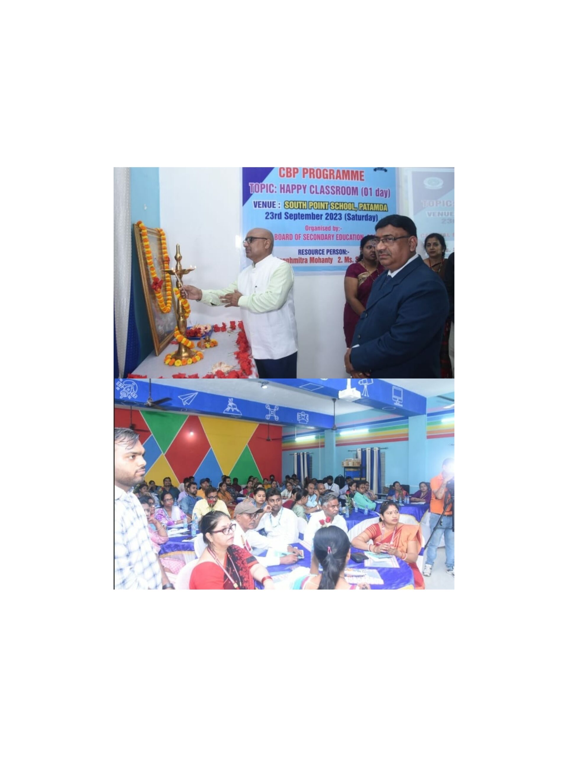 दिनांक 23/9/23 को साउथ प्वाइंट स्कूल गोबरघुसी, पटमदा में सीबीएसई स्कूलों की टीचर्स के लिए सीबीएसई ने एक दिवसीय स्किल्स डेवलपमेंट के लिए कैपेसिटी बिल्डिंग प्रोग्राम्स आयोजित की। जिसका विषय था , ‘हैप्पी क्लासरूम’। इस प्रोग्राम में जमशेदपुर के पूर्वी सिंहभूम के श्री श्री रविशंकर विद्या मंदिर, एनएमएल केरला पब्लिक स्कूल और पश्चिमी सिंहभूम जिले के संत विवेका इंग्लिश मीडियम स्कूल, मधुसूदन पब्लिक स्कूल, दिल्ली पब्लिक स्कूल चकधरपुर, सरायकेला खरसावां के शेन इंटरनेशनल स्कूल और भी अलग-अलग सीबीएसई मान्यता प्राप्त विद्यालयों के प्राचार्य व शिक्षक प्रतिनिधि ने भाग लिया। कार्यक्रम का शुभारंभ विद्या की देवी मां सरस्वती के समक्ष दीप प्रज्वलन व माल्यार्पण कर किया गया। इसके पश्चात विद्यालय के चेयरमैन श्री शिव प्रकाश शर्मा जी ने कार्यक्रम के मुख्य अतिथि ,रिसोर्स पर्सन श्रीमती संघमित्रा मोहंती एसडीएम स्कूल की जूनियर कार्डिनेटर सह भौतिक विज्ञान की शिक्षिका एवं स्वाति कुमारी गणित की शिक्षिका केरला पब्लिक स्कूल वर्मामाइंस को शॉल भेंट कर उनका अभिनंदन और स्वागत किया। विधालय के प्राचार्य श्री अरुण कुमार सिंह जी ने भी रिसोर्स पर्सन को बुके देकर उनका अभिनंदन किया। इस अवसर पर जेवियर हाई स्कूल के डायरेक्टर श्री अशोक तिवारी जी को भी सम्मानित किया गया। बच्चों द्वारा अतिथियों के स्वागत में स्वागत गीत एवं स्वागत नृत्य की सुंदर प्रस्तुति की गई। विद्यालय के चेयरमैन श्री शिव प्रकाश शर्मा जी ने अतिथियों का स्वागत संबोधन किया। रिसोर्स पर्सन ने विभिन्न प्रकार की गतिविधियों द्वारा स्किल्स डेवलपमेंट के गुणों को बताया। तकरीबन 5 घंटे तक आयोजित ट्रेनिंग के दौरान रिसोर्स पर्सन ने ट्रेनिंग से जुड़े तमाम क्रियाकलापों को पावर प्वाइंट प्रेजेंटेशन के जरिए बताते हुए उपस्थित सभी शिक्षकों का मार्गदर्शन किया। विद्यालय के प्राचार्य श्री अरुण कुमार सिंह जी ने सभीj अपनी अहम भूमिका निभाई।