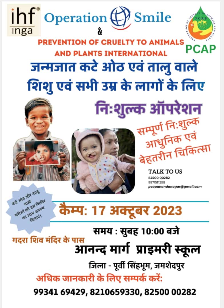 आनन्द मार्ग प्राइमरी स्कूल गदरा शिव मंदिर के पास में ओठ कटा तालुकटा रोगी के लिए नि :शुल्क ऑपरेशन हेतु जांच शिविर का आयोजन सुबह 10:00 बजे से मंगलवार 17 अक्टूबर आनंद मार्ग यूनिवर्सल रिलीफ टीम ग्लोबल,प्रिवेंशन ऑफ़ क्रुएलिटी एनिमल्स एंड प्लांट्स एवं आपरेशन स्माइल के द्वारा किया किया जा रहा है कुपोषण युक्त बच्चे जिनको लेक्टोजन एवं औषधि निःशुल्क उपलब्ध कराया जाएगा सुनील आनंद ने कहा कि कटे होंठ और तालू विकास के दौरान चेहरे के ऊतकों के ठीक से नहीं जुड़ने के कारण होता है यह एक प्रकार का जन्मगत दोष है गर्भावस्था के दौरान धूम्रपान मधुमेह मोटापा अधिक उम्र माँ बनना ,कुपोषण युक्त आहार इत्यादि कारण है ।कटे हुए होंठ एवं तालुका स्थल चिकित्सा के द्वारा सफल इलाज संभव है ऐसे रोगी 1000 जन्म में से एक या दो मिलते हैं ।