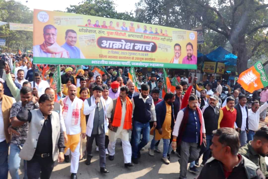 जमशेदपुर। झारखंड की झामुमो-कांग्रेस और राजद गठबंधन सरकार की युवाओं से वादाखिलाफी, संपोषित भ्रष्टाचार, खनिज सम्पदाओं की लूट, ट्रासंफर-पोस्टिंग, महिला उत्पीड़न, बढ़ते अपराध, बदहाल स्वास्थ्य सुविधा एवं पार्टी के तीन विधायकों के ऊपर की गई विद्वेषपूर्ण कार्रवाई के विरोध में भाजपा सड़क पर उतर पर आई है। गुरुवार को भाजपा जमशेदपुर महानगर अध्यक्ष गुंजन यादव के नेतृत्व में हजारों भाजपा कार्यकर्ताओं ने साकची स्थित जिला भाजपा कार्यालय से उपायुक्त कार्यालय तक पैदल मार्च कर सीएम हेमंत सोरेन के खिलाफ आक्रोश प्रदर्शन कर विरोध दर्ज किया। इस दौरान भारी संख्या में जुटे कार्यकर्ताओं ने सड़क पर उतरकर सरकार के विरोध में जमकर नारेबाजी की। इस दौरान पार्टी की ओर से जिला उपायुक्त के माध्यम से महामहिम राज्यपाल के नाम ज्ञापन सौंपा गया। ज्ञापन में बताया गया कि हेमंत सरकार की 4 वर्षों की नाकामियों, वादाखिलाफी ने आम जनता, युवा, महिला, किसान, दलित, आदिवासी सभी वर्गों को आंदोलन के लिए मजबूर किया है। राज्य की जनता न सिर्फ सड़क, बिजली, स्वास्थ्य, शिक्षा जैसी बुनियादी सुविधाओं का संकट झेल रही बल्कि भय और आतंक में भी दिन व्यतीत कर रही है। पूरे प्रदेश में आए दिन हत्या, लूट, अपहरण, बलात्कार, चोरी, डकैती की घटनाएं अखबारों की सुर्खियां बनी हुई है। अपराधियों का मनोबल इस कदर बढ़ा है कि वे जेल में भी हत्या करने में सफल हो रहे हैं। सरकार व्यापारियों को मांगने पर भी सुरक्षा उपलब्ध नहीं करा रही और उनकी हत्या हो जा रही। जिसमें पुलिसकर्मी भी सुरक्षित नहीं है। मुख्यमंत्री हेमंत सोरेन ने सभी संवैधानिक मर्यादाओं को ठेंगा दिखा दिया है। ईडी द्वारा उनसे पूछताछ के लिए छः समन भेजा जा चुका है लेकिन वे पूछताछ से लगातार भाग रहे हैं। उनके द्वारा जांच एजेंसियों के खिलाफ रोज-रोज दिए जा रहे बयानों ने संवैधानिक मर्यादाओं को तार-तार किया है। ज्ञापन में बताया गया कि राज्य का मुख्यमंत्री ही जब कानून का खुल्लम खुल्ला उल्लंघन करने लग जाए तो फिर आम जनता से कानून पालन करने की उम्मीद यह सरकार कैसे कर सकती है।