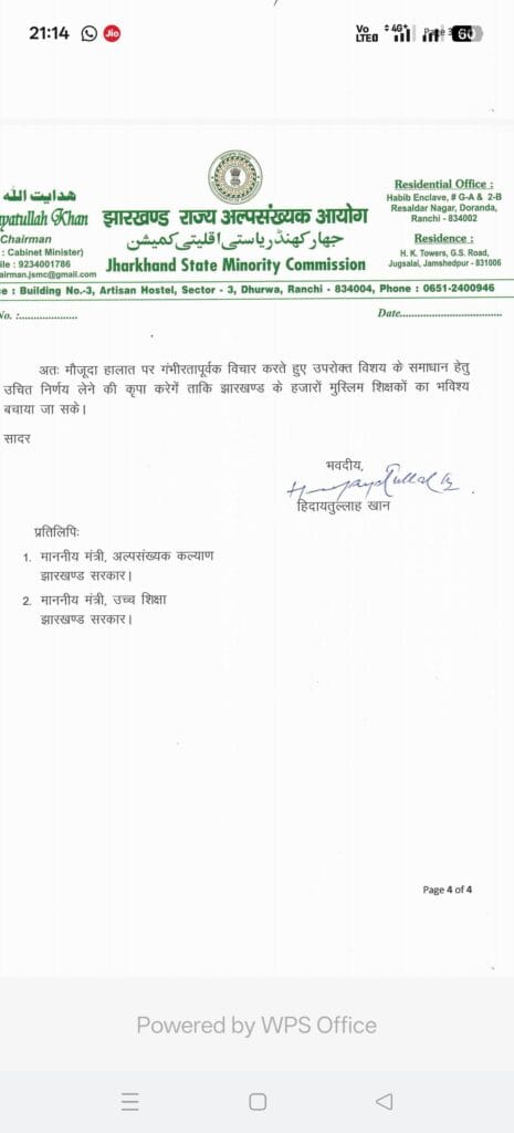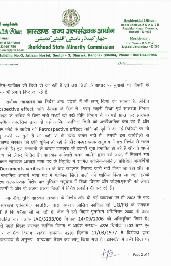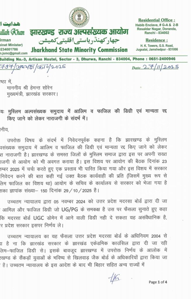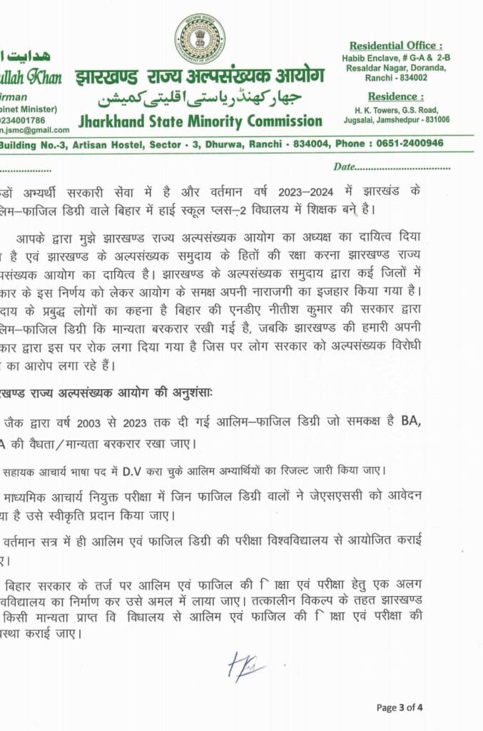 झारखंड राज्य अल्पसंख्यक आयोग ने मुख्यमंत्री श्री हेमंत सोरेन को चिठ्ठी लिखकर मुस्लिम अल्पसंख्यक समुदाय में आलिम व फाजिल की डिग्री एवं मान्यता रद्द किए जाने को लेकर विरोध दर्ज कराया।